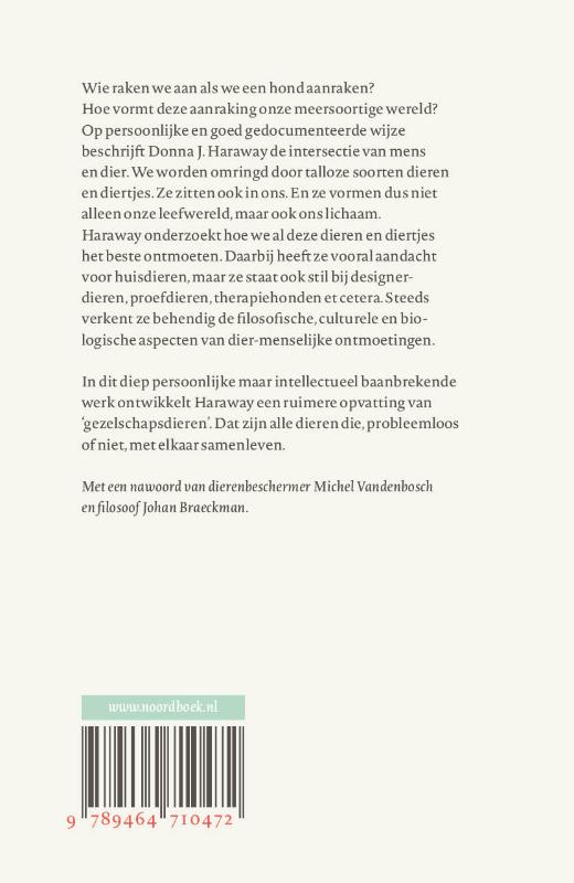 Wie raken we aan als we een hond aanraken? Hoe vormt deze aanraking onze meersoortige wereld? Op persoonlijke en goed gedocumenteerde wijze beschrijft Donna J. Haraway de intersectie van mens en dier. We worden omringd door talloze soorten dieren en diertjes. Ze zitten ook in ons. En ze vormen dus niet alleen onze leefwereld, maar ook ons lichaam.