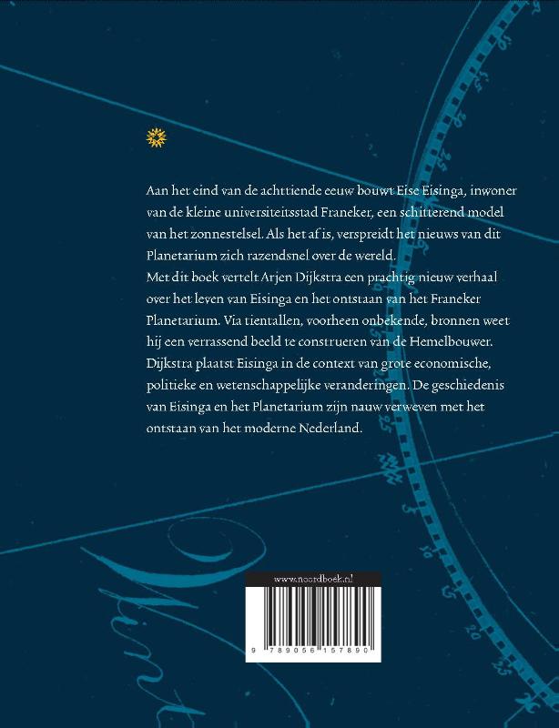 Met dit boek vertelt Arjen Dijkstra een prachtig nieuw verhaal over het leven van Eisinga en het ontstaan van het Franeker Planetarium. Via tientallen, voorheen onbekende, bronnen weet hij een verrassend beeld te construeren van de Hemelbouwer. Dijkstra plaatst Eisinga in de context van grote economische, politieke en wetenschappelijke veranderingen. De geschiedenis van Eisinga en het Planetarium zijn nauw verweven met het ontstaan van het moderne Nederland.
