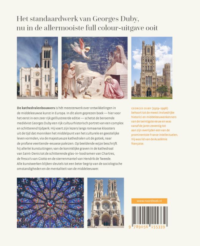 De kathedralenbouwers is hét meesterwerk over ontwikkelingen in de middeleeuwse kunst in Europa. In dit alom geprezen boek – hiervoor het eerst in een zeer rijk geïllustreerde editie – schetst de beroemde mediëvist Georges Duby een rijk cultuurhistorisch portret van een complex en schitterend tijdperk. Hij voert zijn lezers langs romaanse kloosters uit de tijd dat monniken het middelpunt van het culturele en geestelijke leven vormden, via de majestueuze kathedralen uit de gotiek, naar de profane veertiende-eeuwse paleizen. Op beeldende wijze beschrijft hij allerlei kunstuitingen; van koninklijke graven in de kathedraal van Saint-Denis tot de schitterende glas-in-loodramen van Chartres, de fresco’s van Giotto en de sterrenmantel van Hendrik de Tweede. Alle kunstwerken blijken sleutel tot een beter begrip van de sociologische omstandigheden en de mentaliteit van de middeleeuwer.