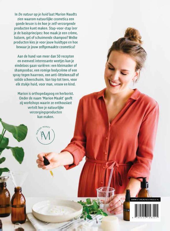 In De natuur op je huid laat Marion Naudts zien waarom natuurlijke cosmetica een goede keuze is én hoe je zelf verzorgende producten kunt maken. Stap-voor-stap leer je de basisprincipes: hoe maak je een crème, balsem, gel of schuimende shampoo? Welke producten kies je voor jouw huidtype en hoe bewaar je jouw zelfgemaakte cosmetica?