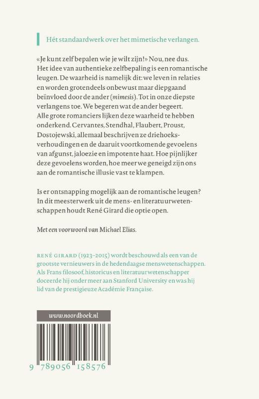 Alle grote romanciers lijken deze waarheid te hebben onderkend. Cervantes, Stendhal, Flaubert, Proust, Dostojewski, allemaal beschrijven ze driehoeksverhoudingen en de daaruit voortkomende gevoelens van afgunst, jaloezie en impotente haat. Hoe pijnlijker deze gevoelens worden, hoe meer we geneigd zijn ons aan de romantische illusie vast te klampen. Is er ontsnapping mogelijk aan de romaneske leugen? In dit meesterwerk uit de mens- en literatuurwetenschappen houdt de Franse cultuurfilosoof René Girard die optie open. Misschien wel. De grote romanciers wijzen een weg.René Girard (1923-2015) wordt beschouwd als een van de grootste vernieuwers in de hedendaagse menswetenschappen. Als Frans filosoof, historicus en literatuurwetenschapper doceerde hij onder meer aan Stanford University en was hij lid van de prestigieuze Académie française.