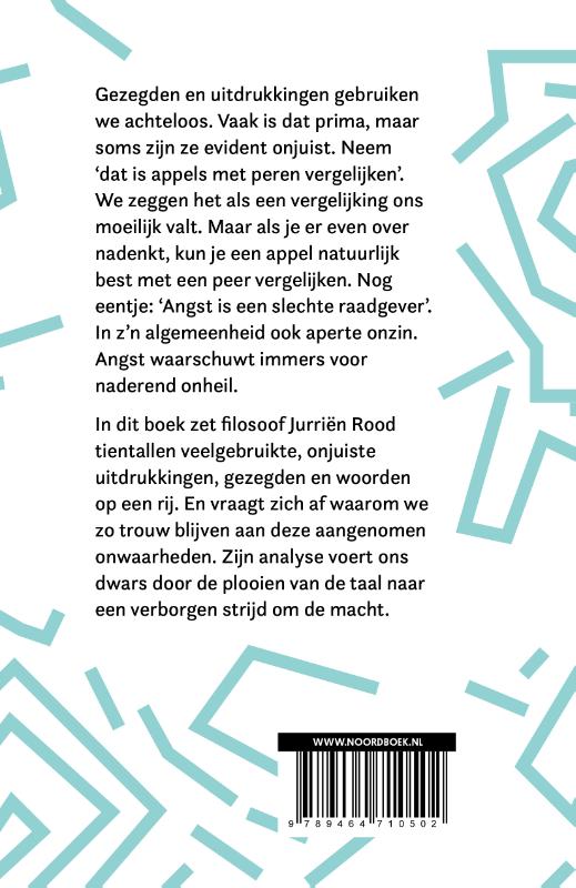 In dit boek zet filosoof Jurriën Rood tientallen veelgebruikte, onjuiste uitdrukkingen, gezegden en woorden op een rij. En vraagt zich af waarom we zo trouw blijven aan deze aangenomen onwaarheden. Zijn analyse voert ons dwars door de plooien van de taal naar een verborgen strijd om de macht.