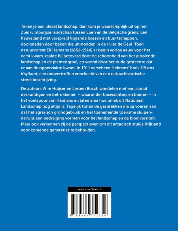 De auteurs Wim Huijser en Jeroen Bosch wandelen met een aantal deskundigen en betrokkenen – waaronder boswachters en boeren – in het voetspoor van Heimans en laten zien hoe uniek dit Nationaal Landschap nog altijd is. Tegelijk tonen de gesprekken die zij voeren aan dat het agrarisch grondgebruik en het toenemende toerisme sluipenderwijs een bedreiging vormen voor het landschap en de biodiversiteit. Maar ook verkennen zij de perspectieven om dit arcadisch stukje Krijtland