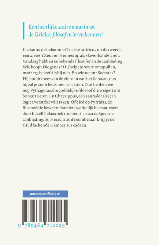 Lucianus, de befaamde Griekse satiricus uit de tweede eeuw, voert Zeus en Hermes op als slavenhandelaren. Vandaag hebben ze bekende filosofen in de aanbieding. Wie koopt Diogenes? Hij helpt je om te ontspullen, maar erg beleefd is hij niet. En wie neemt Socrates? Hij houdt meer van de ziel dan van het lichaam, dus hij zal je zoon heus met rust laten. Dan hebben we nog Pythagoras, die goddelijke filosoof die weigert om bonen te eten. En Chrysippus, een aanrader als je in logica verstrikt wilt raken. Of bied op Pyrrhias, de filosoof die beweert dat niets werkelijk bestaat, waardoor hijzelf helaas ook tot niets in staat is. Speciale aanbieding: bij Heraclitus, de somberaar, krijg je de altijd lachende Democritus cadeau.
