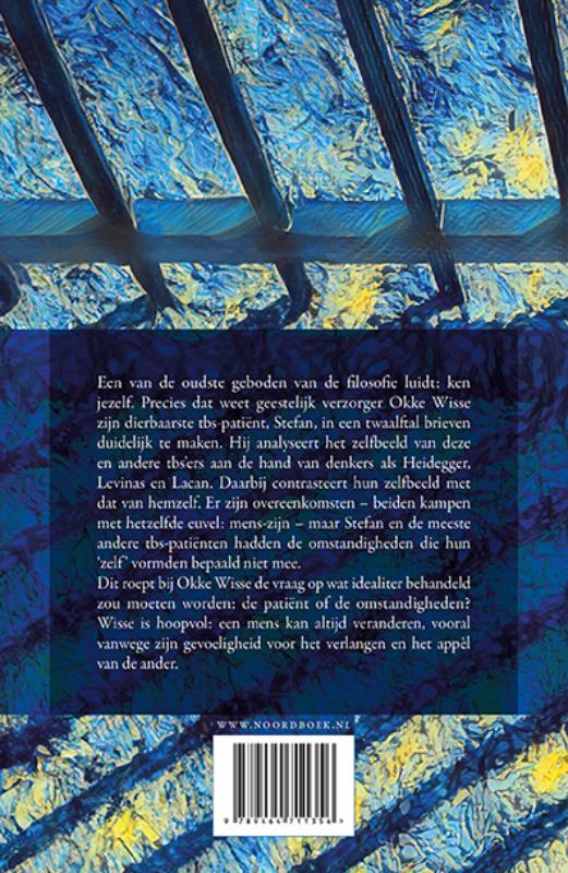 Een van de oudste geboden van de filosofie luidt: ken jezelf. Precies dat weet geestelijk verzorger Okke Wisse zijn dierbaarste tbs-patiënt, Stefan, in een twaalftal brieven duidelijk te maken. Hij analyseert het zelfbeeld van deze en andere tbs’ers aan de hand van denkers als Heidegger, Levinas en Lacan. Daarbij contrasteert hun zelfbeeld met dat van hemzelf. Er zijn overeenkomsten – beiden kampen met hetzelfde euvel: mens-zijn – maar Stefan en de meeste andere tbs-patiënten hadden de omstandigheden die hun ‘zelf’ vormden bepaald niet mee.