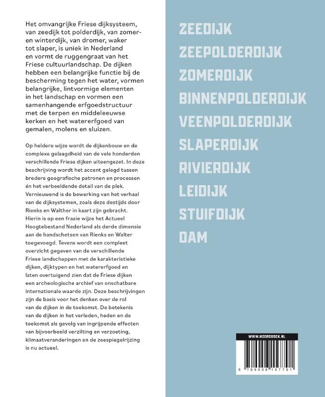 Op heldere wijze wordt de dijkenbouw en de complexe gelaagdheid van de vele honderden verschillende Friese dijken uiteengezet. In deze beschrijving wordt het accent gelegd tussen bredere geografische patronen en processen én het verbeeldende detail van de plek. Vernieuwend is de bewerking van het verhaal van de dijksystemen, zoals deze destijds door Rienks en Walther in kaart zijn gebracht. Hierin is op een fraaie wijze het Actueel Hoogtebestand Nederland als derde dimensie aan de handschetsen van Rienks en Walter toegevoegd. Tevens wordt een compleet overzicht gegeven van de verschillende Friese landschappen met de karakteristieke dijken, dijktypen en het watererfgoed en laten overtuigend zien dat de Friese dijken een archeologische archief van onschatbare internationale waarde zijn. Deze beschrijvingen zijn de basis voor het denken over de rol van de dijken in de toekomst. De betekenis van de dijken in het verleden, heden en de toekomst als gevolg van ingrijpende effecten van bijvoorbeeld verzilting en verzoeting, klimaatveranderingen en de zeespiegelrijzing is nu actueel.