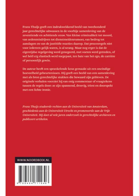 zeventiende en achttiende eeuw. Van kleine criminaliteit tot moord, van zedenmisdrijven tot dienstmeidenrumoer, van bedrog tot aanslagen en van de justitiële reacties daarop. Dat procesregels niet voor iedereen gelijk waren, is al wrang. Maar nog erger is dat de eigentijdse regelgeving werd genegeerd, met voeten werd getreden, of wel héél erg elastisch werd toegepast, ten bate van het ego, de carrière of persoonlijk gewin. De auteur heeft een sprankelende keus gemaakt uit een oneindige hoeveelheid gebeurtenissen. Hij geeft een beeld van een samenleving met als bron gerechtelijke stukken die bewaard zijn gebleven. De originele verhalen voorziet hij van enig commentaar of vraagtekens tussen de regels door: ze zijn spannend, droevig, triest en doorspekt met een lichte ironie.
