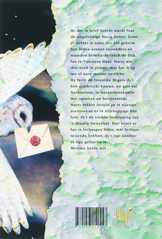 As der in brief brocht wurdt foar de ûngelokkige Harry Potter, komt er achter in tsien jier âld geheim. Syn âlden wienen tsjoenders en waarden fermoarde troch de flok fan in Tsjustere Hear. Harry wie doe noch in poppe, mar hat it op ien of oare manier oerlibbe. Hy ferlit de freeslike Migels dy’t him grutbrocht hawwe, en giet nei Swiniastate, in tsjoendersskoalle mei spoeken en betsjoenings. Harry rekket fersyld yn in tsjuster aventoer as er in trijekoppige hûn fynt, dy’t de tredde ferdjipping fan ‘e skoalle bewekket. Dan heart er fan in ferburgen Stien, mei ferbjusterjende krêften, dy’t tige kostber of tige gefaarlik is.