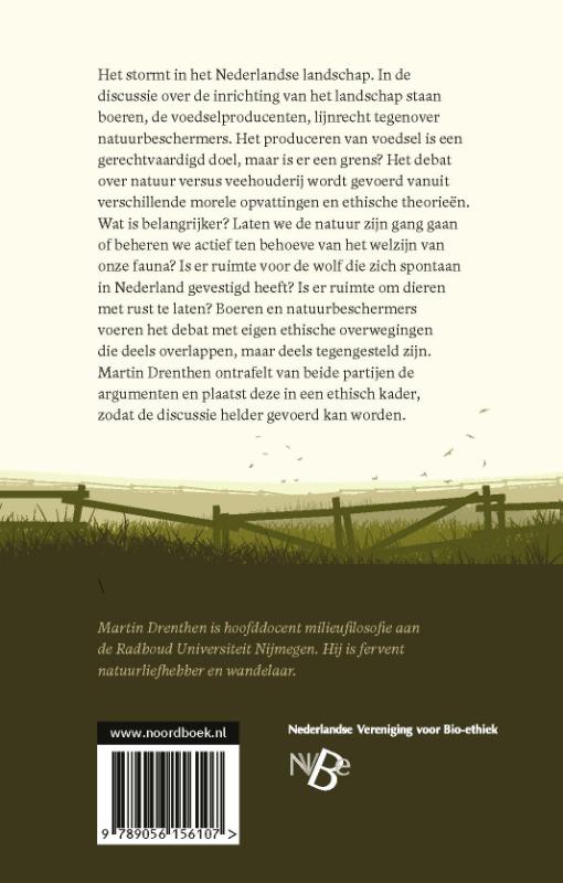 boeren mengen zich fel in het debat, met een eigen pakket aan ethische overwegingen die deels overlappen met, maar deels ook tegengesteld zijn aan die van de natuurbeschermers. Martin Drenthen ontrafelt van beide partijen de argumenten en plaatst deze in een ethisch kader, zodat de discussie met alle voors en tegens in ieder geval helder gevoerd kan worden.