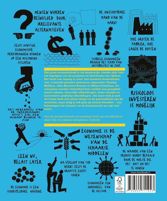 Het grote economieboek is uw jargonvrije, visuele gids voor het begrijpen van de productie en distributie van rijkdom. Het biedt een ingang in meer dan honderd sleutelideeën van ‘s werelds grootste economen, waaronder Thomas Malthus, John Maynard Keynes en Milton Friedman. De concepten worden verhelderd door middel van gezaghebbende teksten, kleurrijke afbeeldingen, leuke weetjes en innovatieve grafische afbeeldingen. Als lezer duik je met dit fraaie boek niet alleen dieper in de geschiedenis van de economie, maar krijg je ook grip op actuele kwesties – van belastingen tot recessie, tot de huizenmarkt en nog veel meer!