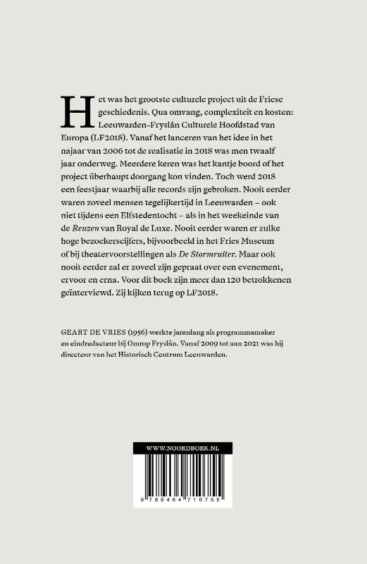 Het was het grootste culturele project uit de Friese geschiedenis. Qua omvang, complexiteit en kosten: Leeuwarden-Fryslân Culturele Hoofdstad van Europa (LF2018). Vanaf het lanceren van het idee in het najaar van 2006 tot de realisatie in 2018 was men twaalf jaar onderweg. Meerdere keren was het kantje boord of het project überhaupt doorgang kon vinden. Toch werd 2018 een feestjaar waarbij alle records zijn gebroken. Nooit eerder waren zoveel mensen tegelijkertijd in Leeuwarden – ook niet tijdens een Elfstedentocht – als in het weekeinde van de Reuzen van Royal de Luxe. Nooit eerder waren er zulke hoge bezoekerscijfers, bijvoorbeeld in het Fries Museum of bij theatervoorstellingen als De Stormruiter. Maar ook nooit eerder zal er zoveel zijn gepraat over een evenement, ervoor en erna. Voor dit boek zijn meer dan 120 betrokkenen geïnterviewd. Zij kijken terug op LF2018.