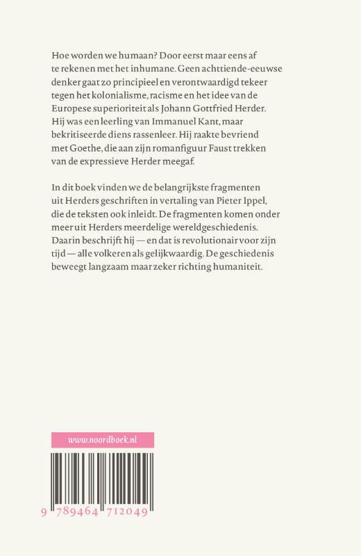 In dit boek vinden we de belangrijkste fragmenten uit Herders geschriften in vertaling van Pieter Ippel, die de teksten ook inleidt. De fragmenten komen onder meer uit Herders meerdelige wereldgeschiedenis. Daarin beschrijft hij — en dat is revolutionair voor zijn tijd — alle volkeren als gelijkwaardig. De geschiedenis beweegt langzaam maar zeker richting humaniteit.