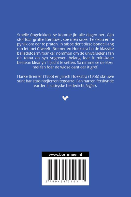 Smelle ûngelokken, se komme jin alle dagen oer. Gjin stof foar grutte literatuer, soe men sizze. Te sleau en te pynlik om oer te praten. In taboe dêr’t dizze bondel lang om let mei ôfweeft. Bremer en Hoekstra ha de klassike balladefoarm foar kar nommen om de universelens fan dit tema en syn yngreven belang foar it minskene bestean klear yn ’t ljocht te setten. Sa nimme se de lêzer mei fan foar de widze oant oer it grêf.