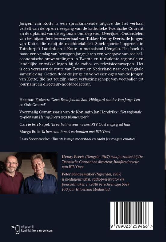 ‘Jongen van Kotte’ is een spraakmakende uitgave die het verhaal vertelt van de op- en neergang van de katholieke Twentsche Courant en de opkomst van de regionale omroep voor Overijssel. Onderdelen van het bijzondere levensverhaal van Tukker Henny Everts, de ‘Jongen van Kotte’, die nabij de machinefabriek Stork sportief opgroeit in Tuindorp ’t Lansink en ’t Kotte in metaalstad Hengelo. Het boek is naast een verslag van bewogen jonge jaren een weergave van sociaaleconomische omwentelingen in Twente en turbulente regionale en landelijke ontwikkelingen bij de radio- en televisieomroepen. Het is een verrassende route van Twente en Nederland naar een digitale samenleving. Gezien door de jonge en volwassen ogen van de Jongen van Kotte, die het tot zijn eigen verbazing schopt van voetballer tot journalist bij de Twentsche Courant en directeur-hoofdredacteur van RTV Oost.