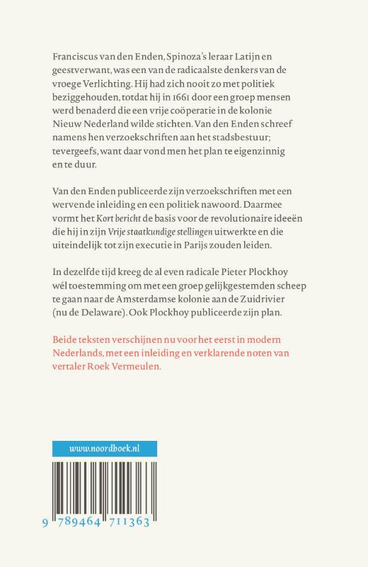 Franciscus van den Enden, Spinoza’s leraar Latijn en geestverwant, was een van de radicaalste denkers van de vroege Verlichting. Hij had zich nooit zo met politiek beziggehouden, totdat hij in 1661 door een groep mensen werd benaderd die een vrije coöperatie in de kolonie Nieuw Nederland wilde stichten. Van den Enden schreef namens hen verzoekschriften aan het stadsbestuur; tevergeefs, want daar vond men het plan te eigenzinnig en te duur.