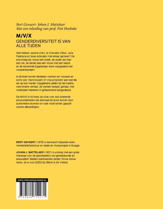 Wat hebben Jeanne d’Arc, le Chevalier d’Éon, Julia Pastrana en farao Achnaton met elkaar gemeen? De een droeg als vrouw een broek, de ander als man een rok, de derde was een vrouw met een baard en de beroemde Egyptenaar werd voorgesteld met borsten! In Genderdiversiteit is van alle tijden komen tientallen mannen, vrouwen en soms ook ‘manvrouwen’ of ‘vrouwmannen’ aan bod die elk op hun manier het traditionele binaire verhaal in twijfel trokken. Ze werden vaak bespot, gehaat, maar ook medelijdend bekeken of gefascineerd aangestaard. Behalve de vraagtekens die zij keer op keer plaatsen bij het binaire verhaal, hebben de M/V/X in dit boek nóg iets gemeen. Het zijn stuk voor stuk boeiende persoonlijkheden die tot leven komen door het gebruik van authentieke bronnen en vaak nooit eerder gepubliceerde afbeeldingen.