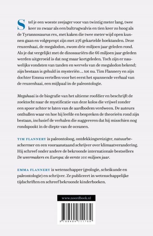 Stel je een woeste zeejager voor van twintig meter lang, twee keer zo zwaar als een bultrugwalvis en tien keer zo hoog als de Tyrannosaurus rex, met kaken die twee meter wijd open kunnen gaan en volgepropt zijn met 276 gekartelde hoektanden. Deze reuzenhaai, de megalodon, zwom drie miljoen jaar geleden rond. Als je dat vergelijkt met de dinosauriërs die 66 miljoen jaar geleden werden uitgeroeid is dat nog maar kortgeleden. Toch zijn er nauwelijks vondsten van tanden en wervels van de megalodon bekend; zijn bestaan is gehuld in mysteriën … tot nu. Tim Flannery en zijn dochter Emma vertellen voor het eerst het spannende verhaal van de reuzenhaai, een mijlpaal in de paleontologie.