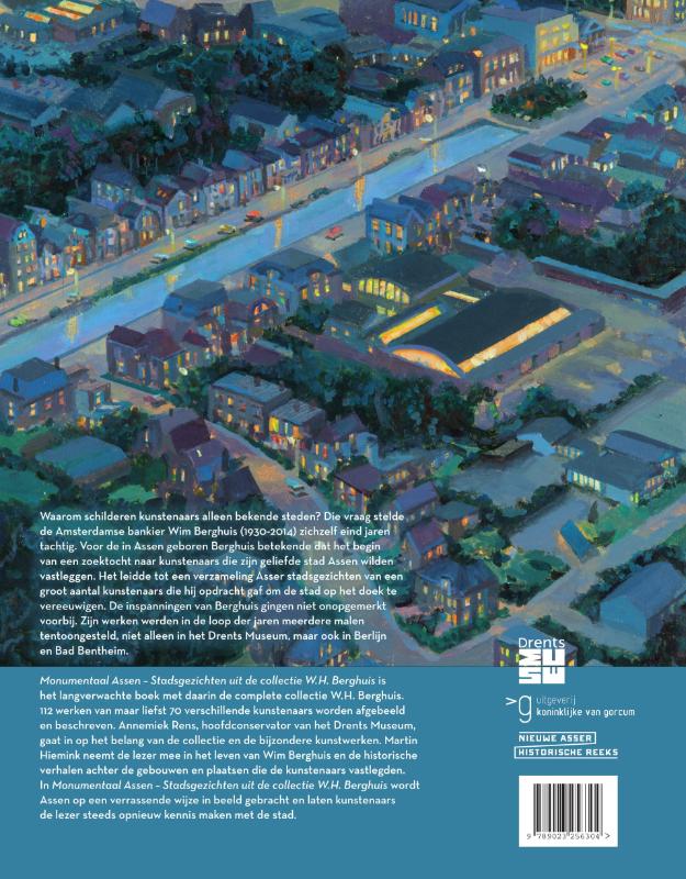 Monumentaal Assen – Stadsgezichten uit de Collectie W.H. Berghuis is het langverwachte boek met daarin de complete Collectie dr. W.H. Berghuis. 112 werken van maar liefst 70 verschillende kunstenaars worden afgebeeld en beschreven. Annemiek Rens, Hoofdconservator van het Drents Museum, gaat in op het belang van de collectie en de bijzondere kunstwerken. Martin Hiemink neemt de lezer mee in het leven van Wim Berghuis en de historische verhalen achter de gebouwen en plaatsen die de kunstenaars vastlegden. In Monumentaal Assen – Stadsgezichten uit de Collectie dr. W.H. Berghuis wordt Assen op een verrassende wijze in beeld gebracht en laten kunstenaars de lezer steeds opnieuw kennis maken met de stad.