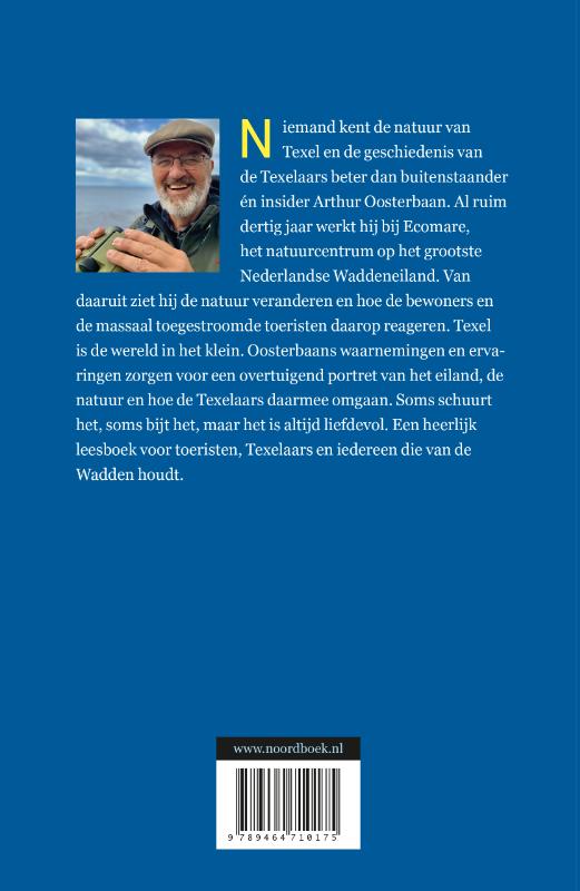 Niemand kent de natuur van Texel en de geschiedenis van de Texelaars beter dan buitenstaander én insider Arthur Oosterbaan. Al ruim dertig jaar werkt hij bij Ecomare, het natuurcentrum op het grootste Nederlandse Waddeneiland. Van daaruit ziet hij de natuur veranderen en hoe de bewoners en de massaal toegestroomde toeristen daarop reageren. Texel is de wereld in het klein. Oosterbaans waarnemingen en ervaringen zorgen voor een overtuigend portret van het eiland, de natuur en hoe de Texelaars daarmee omgaan. Soms schuurt het, soms bijt het, maar het is altijd liefdevol. Een heerlijk leesboek voor toeristen en Texelaars!