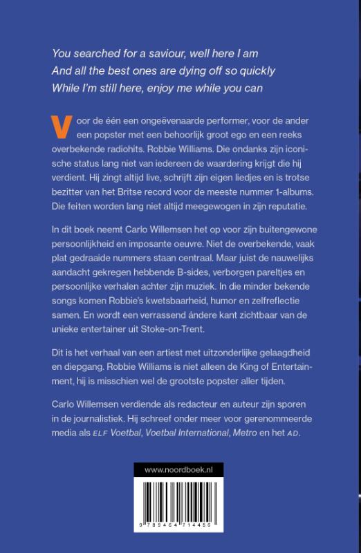In dit boek neemt Carlo Willemsen het op voor zijn buitengewone persoonlijkheid en imposante oeuvre. Niet de overbekende, vaak plat gedraaide nummers staan centraal. Maar juist de nauwelijks aandacht gekregen hebbende B-sides, verborgen pareltjes en persoonlijke verhalen achter zijn muziek. In die minder bekende songs komen Robbie’s kwetsbaarheid, humor en zelfreflectie samen. En wordt een verrassend ándere kant zichtbaar van de unieke entertainer uit Stoke-on-Trent.