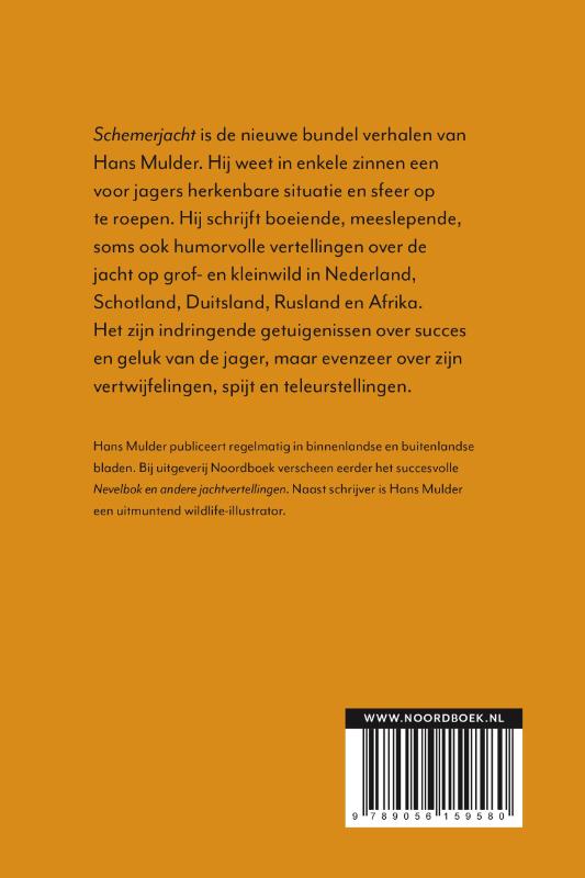 Schemerjacht bevat, na het succesvolle Nevelbok en andere jachtvertellingen, een nieuwe bundel verhalen over de jacht van Hans Mulder, de meest gewilde jachtauteur van dit moment. In het boek leest u boeiende, meeslepende, soms ook humorvolle vertellingen over de jacht op grof- en kleinwild in Nederland, Schotland, Duitsland, Rusland en Afrika; indringende getuigenissen over succes en geluk van de jager, maar evenzeer over zijn vertwijfelingen, spijt en teleurstellingen. Mulder weet in enkele zinnen een voor jagers herkenbare situatie en sfeer op te roepen. Zijn verhalen verschijnen regelmatig in tijdschriften in binnen- en buitenland. Het boek is prachtig geïllustreerd door de schrijver zelf; naast schrijver is Hans Mulder ook een uitmuntend wildlife-illustrator.