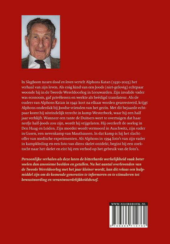 In Slagboom tussen dood en leven vertelt Alphons Katan (1930-2025) het verhaal van zijn leven. Als enig kind van een Joods (niet-gelovig) echtpaar woonde hij in de Tweede Wereldoorlog in Leeuwarden. Zijn invalide vader was econoom, gaf privélessen en werkte als beëdigd translateur. Als de ouders van Alphons Katan in 1942 kort na elkaar worden gearresteerd, krijgt Alphons onderdak bij Joodse vrienden van het gezin. Met dit bejaarde echtpaar komt hij uiteindelijk terecht in kamp Westerbork, waar hij een half jaar verblijft. Wanneer een tante de Duitsers weet te overtuigen dat haar neefje half-Joods zou zijn, wordt hij vrijgelaten. Hij overleeft de oorlog in Den Haag en Leiden. Zijn moeder wordt vermoord in Auschwitz, zijn vader in Gusen, een nevenkamp van Mauthausen. In dat kamp is hij het slachtoffer van medische experimenten. Als Alphons in 1994 foto’s van zijn vader in kampkleding en een foto van diens skelet ontdekt, begint hij een zoektocht naar het skelet en eist hij een verbod op het gebruik van de foto’s.