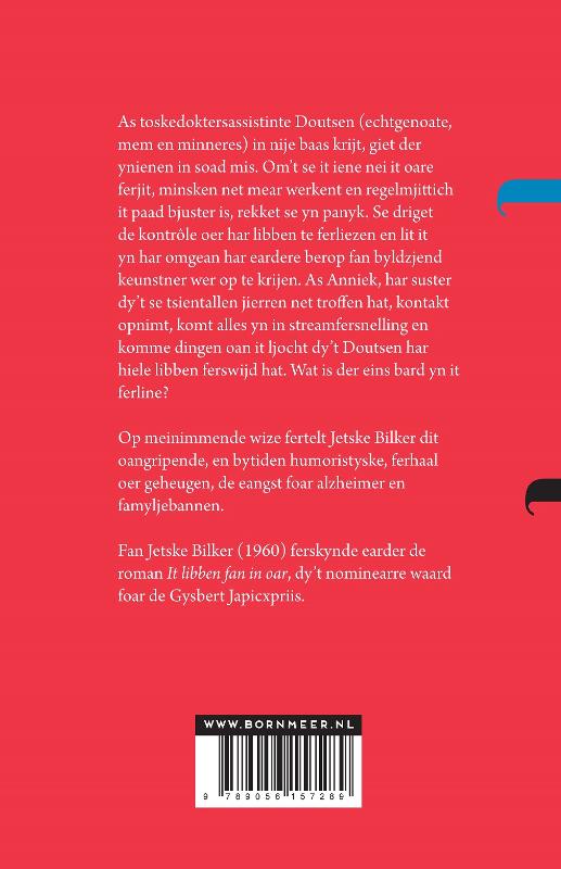 € 22,90As toskedoktersassistinte Doutsen (echtgenoate, mem en minneres) in nije baas krijt, giet der ynienen in soad mis. Om’t se it iene nei it oare ferjit, minsken net mear werkent en regelmjittich it paad bjuster is, rekket se yn panyk. Se driget de kontrôle oer har libben te ferliezen en lit it yn har omgean har eardere berop fan byldzjend keunstner wer op te krijen. As Anniek, har suster dy’t se tsientallen jierren net troffen hat, kontakt opnimt, komt alles yn in streamfersnelling en komme dingen oan it ljocht dy’t Doutsen har hiele libben ferswijd hat. Wat is der eins bard yn it ferline?