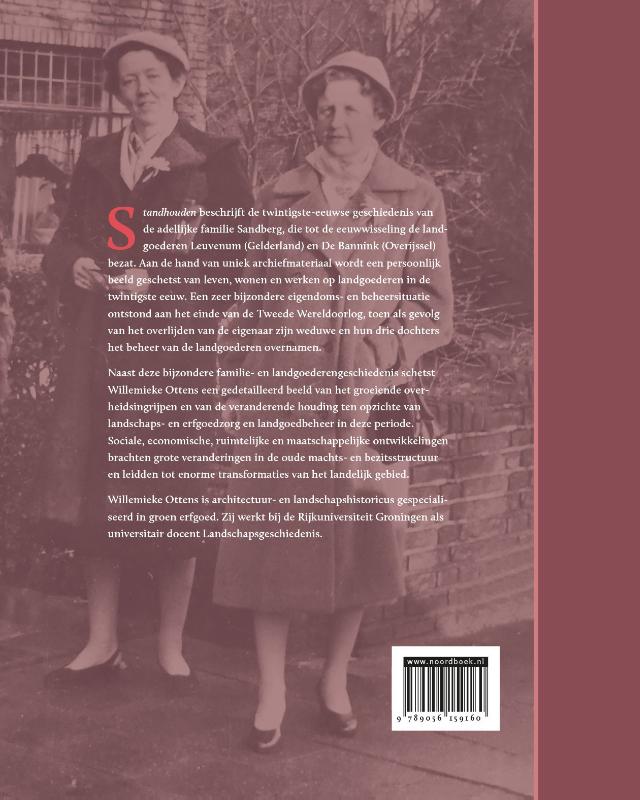Standhouden beschrijft de twintigste-eeuwse geschiedenis van de adellijke familie Sandberg, die tot de eeuwwisseling de landgoederen Leuvenum (Gelderland) en De Bannink (Overijsel) bezat. Aan de hand van uniek archiefmateriaal wordt een persoonlijk beeld geschetst van leven, wonen en werken op landgoederen in de twintigste eeuw. Een zeer bijzondere eigendoms- en beheersituatie ontstond aan het einde van de Tweede Wereldoorlog, toen als gevolg van het overlijden van de eigenaar zijn weduwe en hun drie dochters het beheer van de landgoederen overnamen.