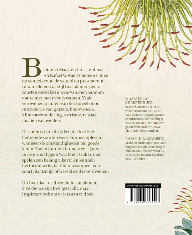 Botanici Maarten Christenhusz en Rafaël Govaerts nemen u mee op een reis rond de wereld en presenteren in ware detective-stijl hoe plantenjagers soorten ontdekken waarvan men aannam dat ze niet meer voorkwamen. Vaak verdwenen planten van het toneel door introductie van grazers, bouwwoede, klimaatverandering, toerisme, te vaak maaien van weiden.