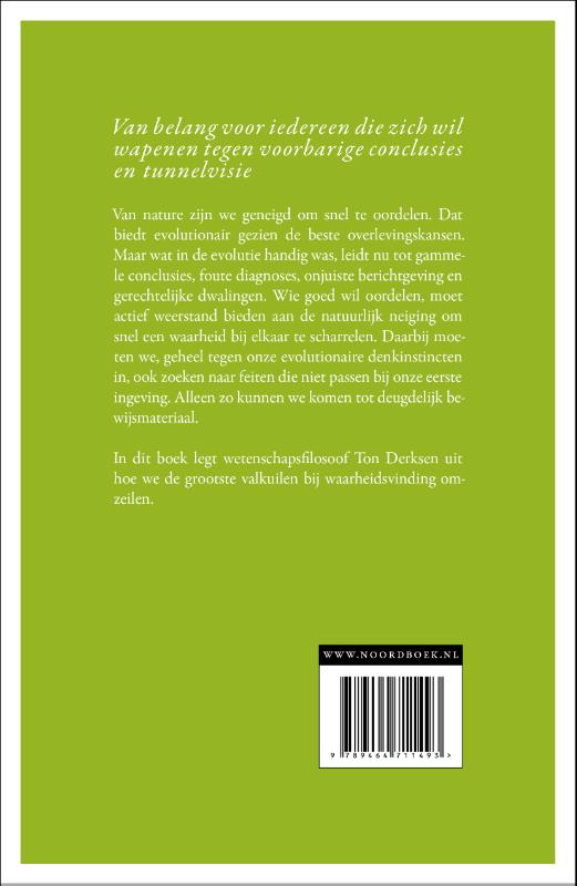 Van nature zijn we geneigd om snel te oordelen. Dat biedt evolutionair gezien de beste overlevingskansen. Maar wat in de evolutie handig was, leidt nu tot gammele conclusies, foute diagnoses, onjuiste berichtgeving en gerechtelijke dwalingen. Wie goed wil oordelen, moet actief weerstand bieden aan de natuurlijk neiging om snel een waarheid bij elkaar te scharrelen. Daarbij moeten we, geheel tegen onze evolutionaire denkinstincten in, ook zoeken naar feiten die niet passen bij onze eerste ingeving. Alleen zo kunnen we komen tot deugdelijk bewijsmateriaal.
