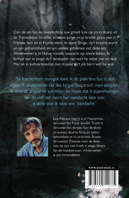 Lex Paleaux (1977) is in Haarlimske skriuwer fan Frysk komôf. Troch it skriuwen fan skripts foar ferskate tv-searjes, koarte films en teäter ûntwikkele er in orizjinele, fisuele skriuwstyl. Paleaux nimt de lêzer mei op syn reis troch it jonge libben fan de haadpersoan. Winterwetter is syn romandebút.